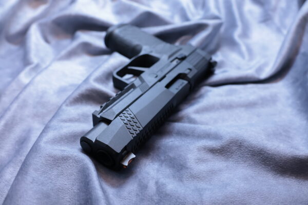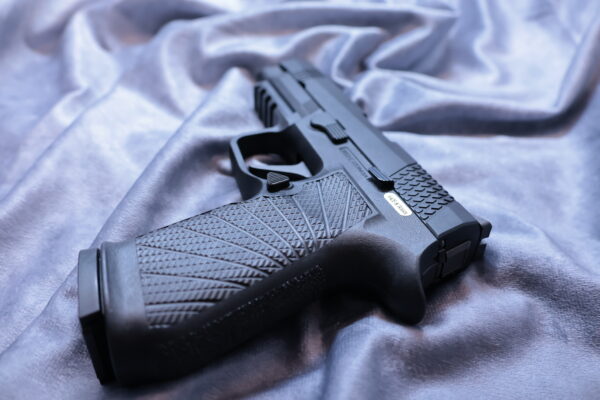 この9mmピストルには、ウィルソンコンバット特製のP320グリップモジュールとX-TACパターンのセレーション加工を施したカスタムスライドが採用された。