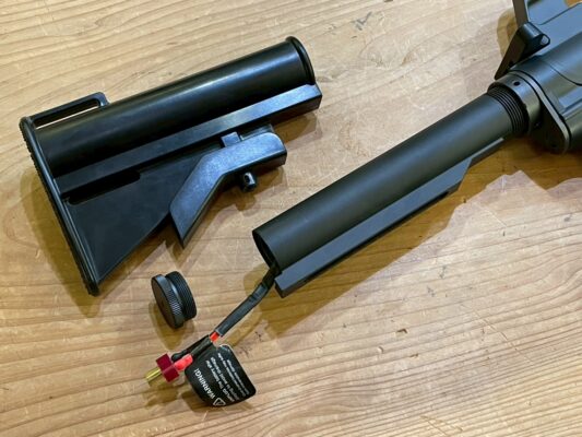 バッテリーはストックパイプに接続可能で、ストックパイプはスクリューキャップを採用する事で脱落を防止しています。